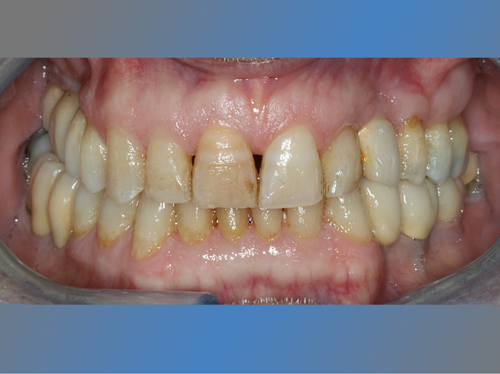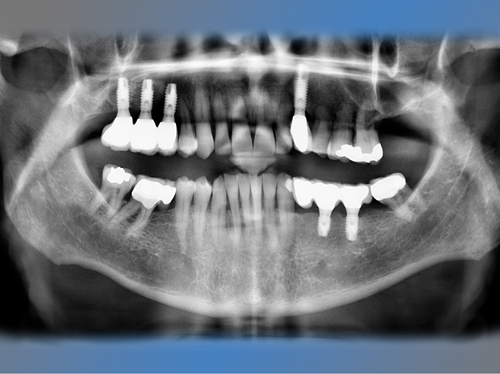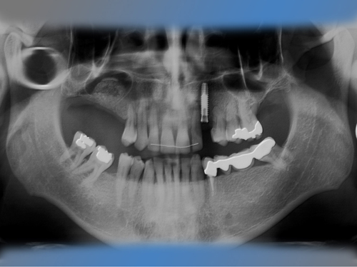 También se le sustituya el puente de la mandíbula que presentaba movilidad debido a caries en los dientes pilares por dos implantes y se le coloca otro implante en un canino superior ausente.