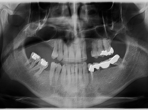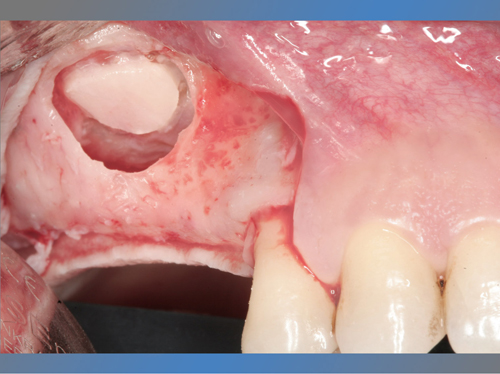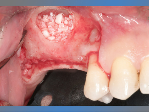 En el maxilar superior tenía poco hueso debido a la presencia del seno maxilar, por lo que se le trato con la técnica de injerto óseo conocida como elevación de seno directa para poder colocarle implantes.